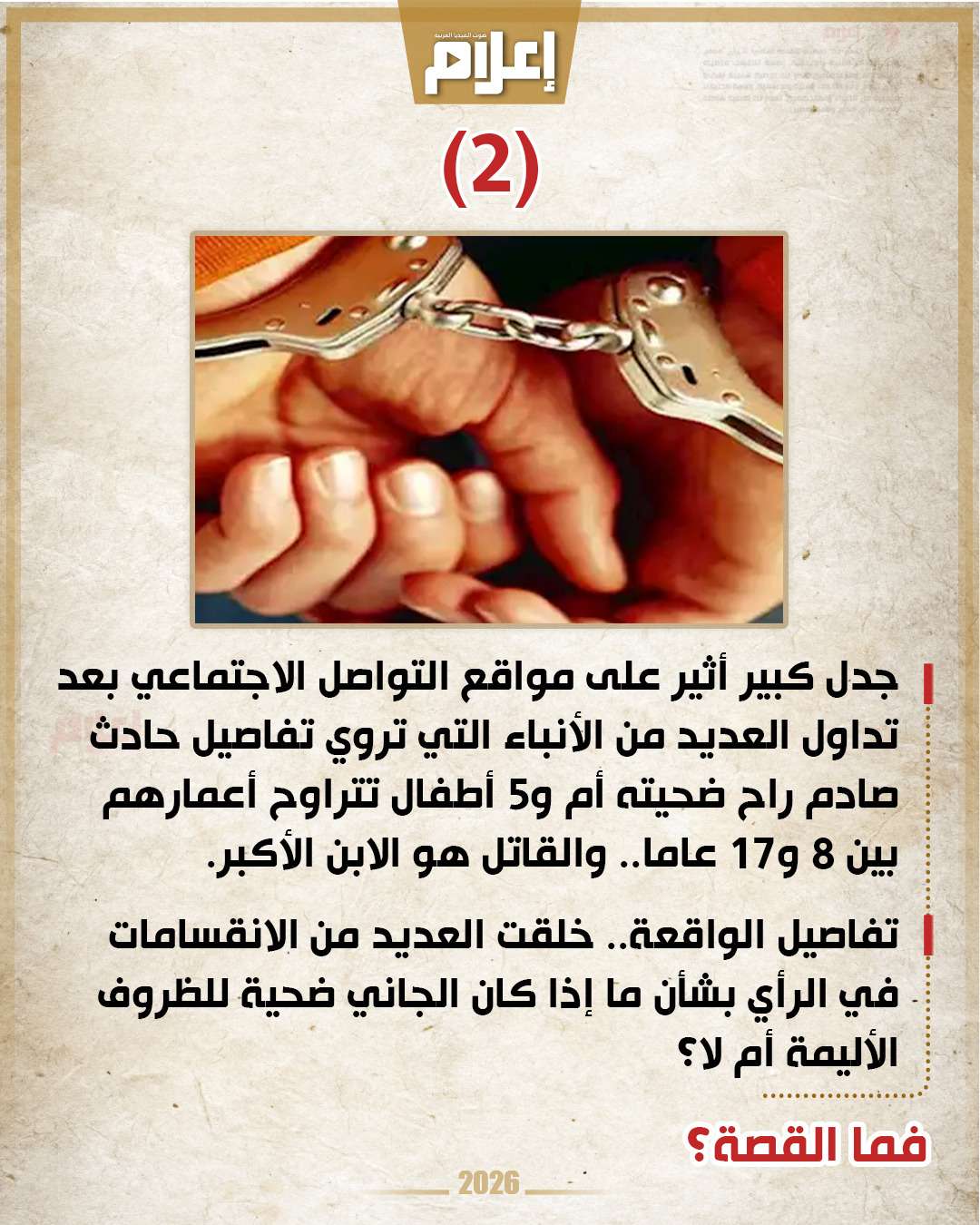 جدل كبير أثير على مواقع التواصل الاجتماعي بعد تداول العديد من الأنباء التي تروي تفاصيل حادث صادم راح ضحيته أم و5 أطفال تتراوح أعمارهم بين 8 و17 عاما.. والقاتل هو الابن الأكبر.