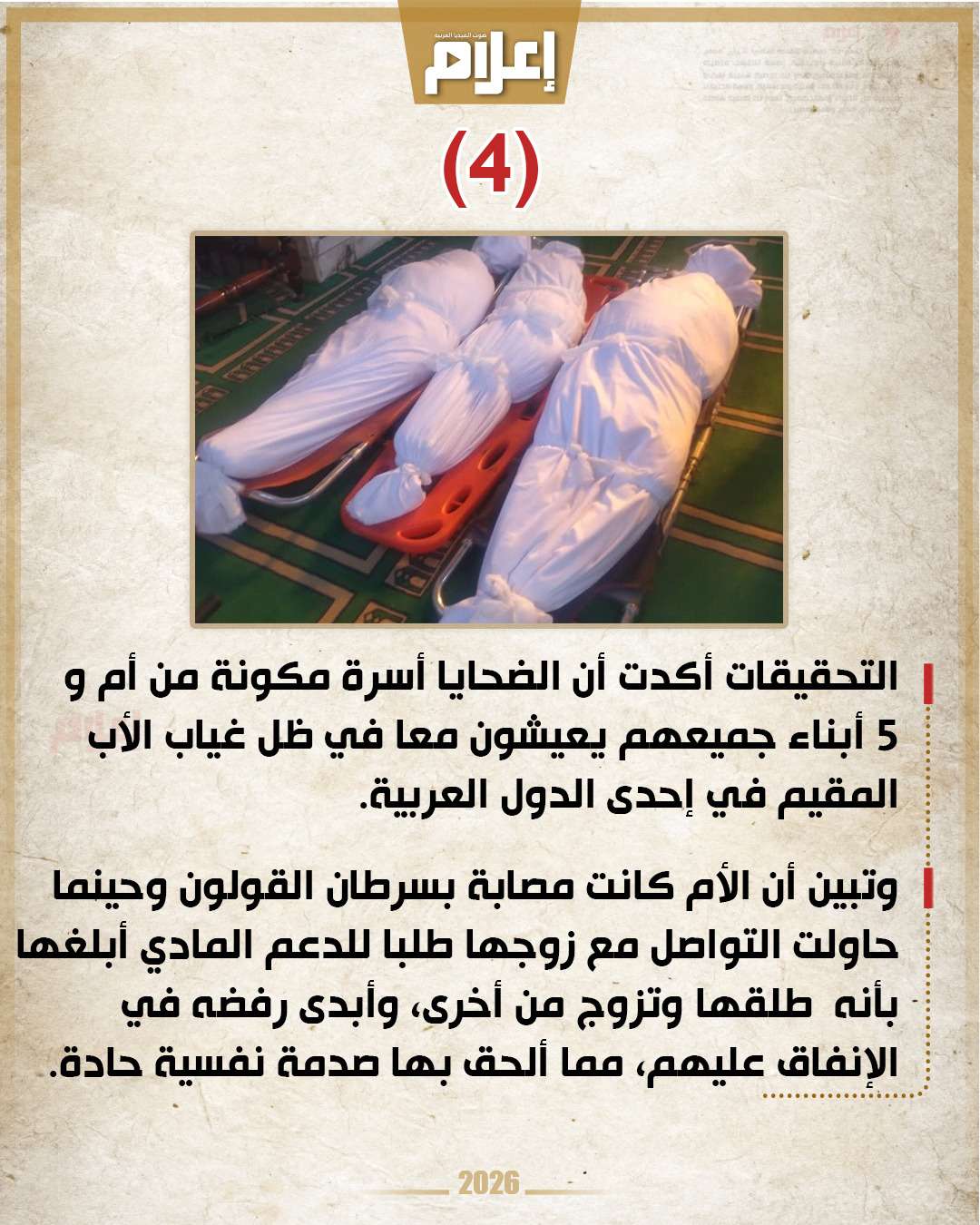 التحقيقات أكدت أن الضحايا أسرة مكونة من أم و5 أبناء جميعهم يعيشون معا في ظل غياب الأب المقيم في إحدى الدول العربية.