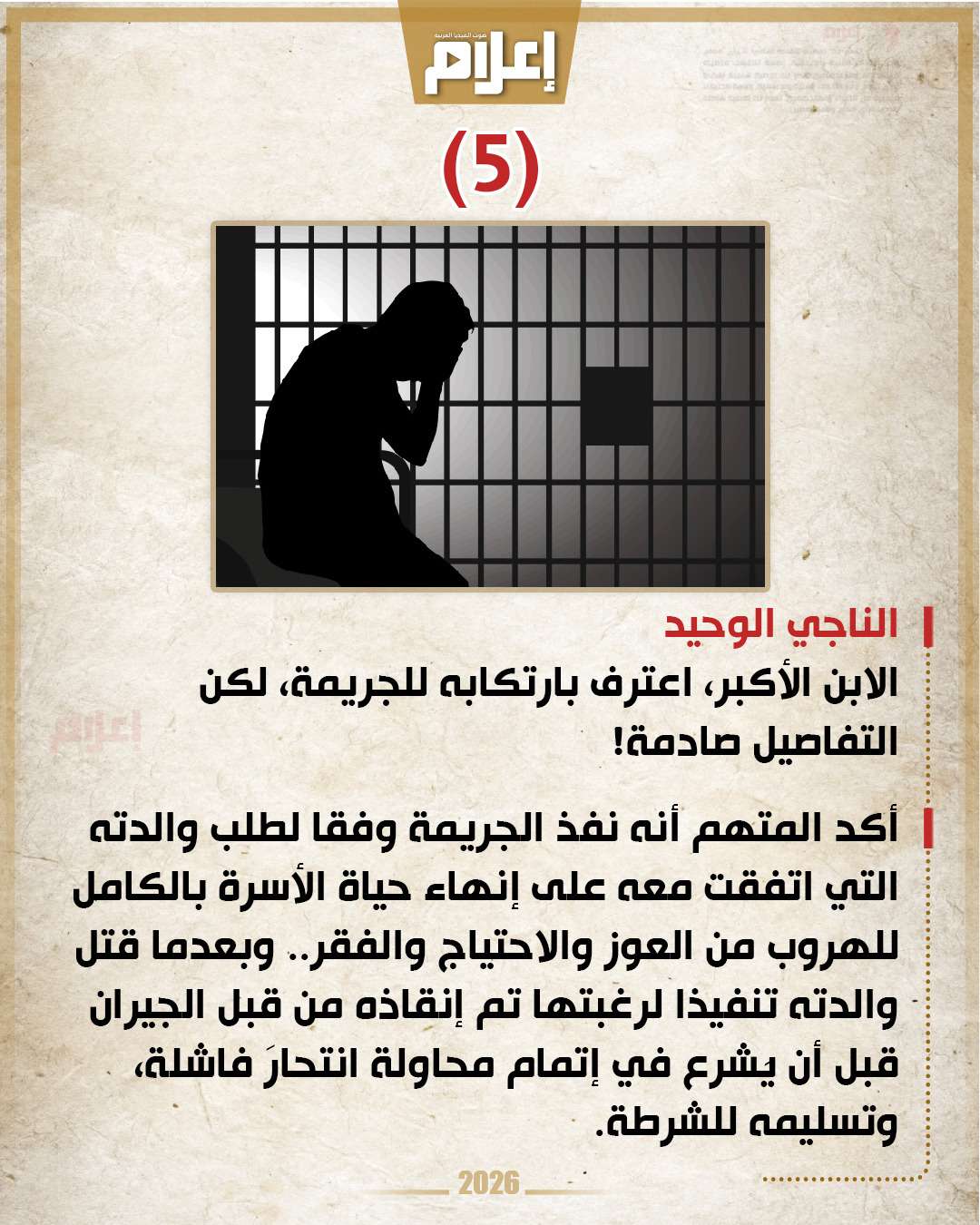 الابن الأكبر، اعترف بارتكابه للجريمة، لكن التفاصيل صادمة!، إذ أكد المتهم أنه نفذ الجريمة وفقا لطلب والدته التي اتفقت معه على إنهاء حياة الأسرة بالكامل للهروب من العوز والاحتياج والفقر.. وبعدما قتل والدته تنفيذا لرغبتها تم إنقاذه من قِبل الجيران قبل أن يَشرع في إتمام محاولة انتحار فاشلة، وتسليمه للشرطة.