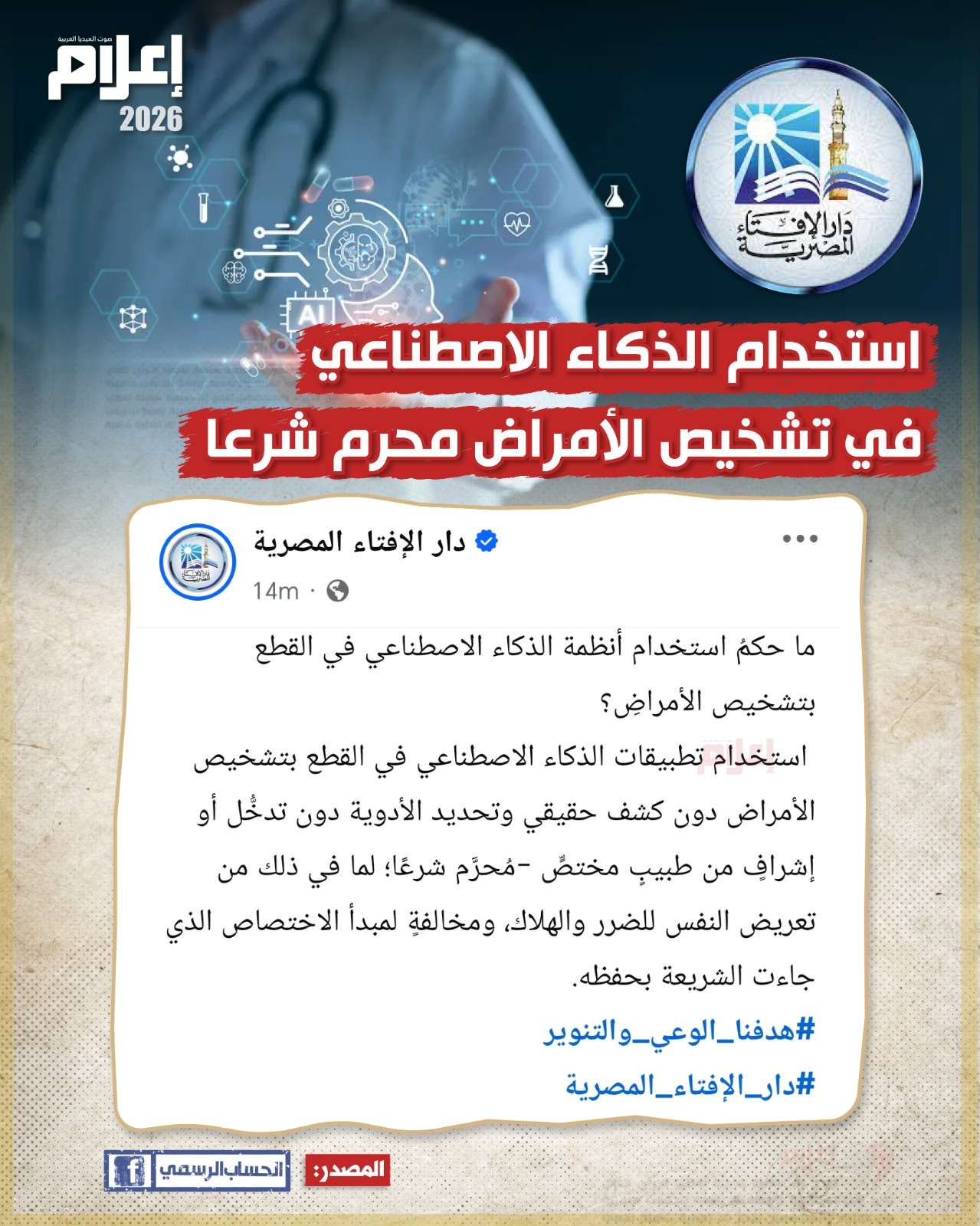 أشارت "دار الإفتاء المصرية" عبر حسابها الرسمي على موقع "فيس بوك" إلى أن اللجوء إلى هذه الأنظمة دون إشراف طبي مباشر يُعد مخالفة للضوابط الشرعية، موضحة: "استخدام تطبيقات الذكاء الاصطناعي في القطع بتشخيص الأمراض دون كشف حقيقي وتحديد الأدوية دون تدخل أو إشراف طبيب مختص .. مُحرَّم شرعًا".