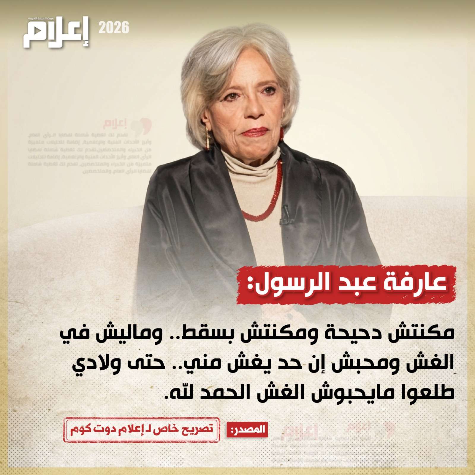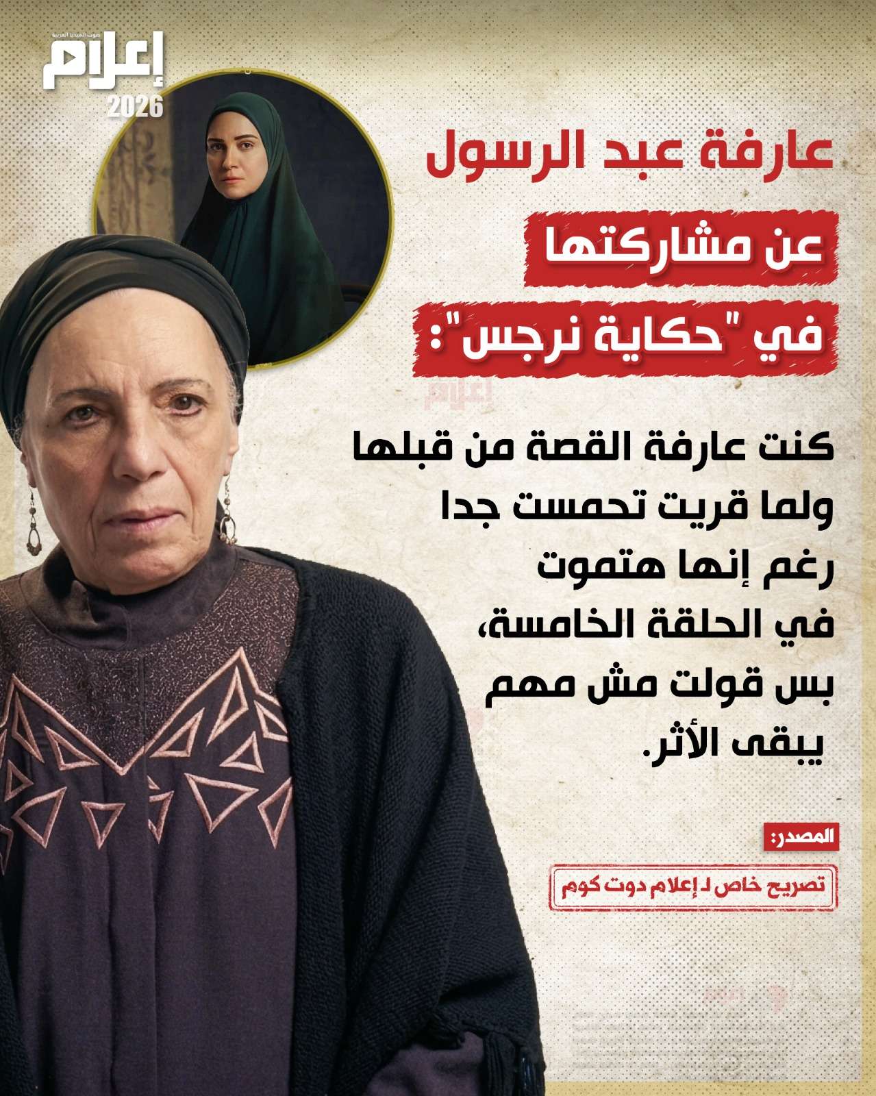 من ناحية أخرى، تحدثت "عبد الرسول" عن مشاركتها في مسلسل "حكاية نرجس"، الذي نال العديد من الإشادات عقب عرضه خلال النصف الثاني من موسم رمضان 2026، وقالت إنها كانت تعرف تفاصيل الواقعة الأصلية حينما قرأت السيناريو لأول مرة، ورغم أن مساحة الدور ليست كبيرة، إلا أن الدافع وراء قبولها للدور كان تأثيره.