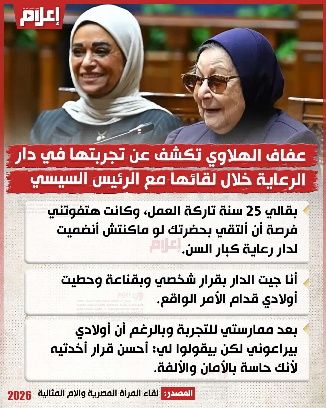 قالت "الهلاوي" خلال لقاء المرأة المصرية والأم المثالية، بحضور الرئيس عبدالفتاح السيسي في قصر الاتحادية، اليوم الأربعاء الموافق 25 مارس 2026: "بقالي 25 سنة تاركة العمل، وكانت هتفوتني فرصة أن ألتقي بحضرتك سيادة الرئيس لو ماكنتش أنضميت لدار رعاية كبار السن".