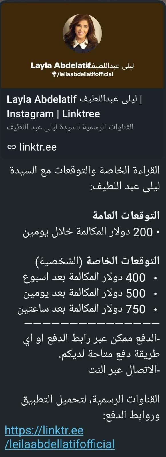 وتقدم ليلى عبد اللطيف خدمة خاصة للتوقعات السخصية عبر مكالمات تقدمها للراغبين في ذلك، ونرصد أسعارها فيما يلي: