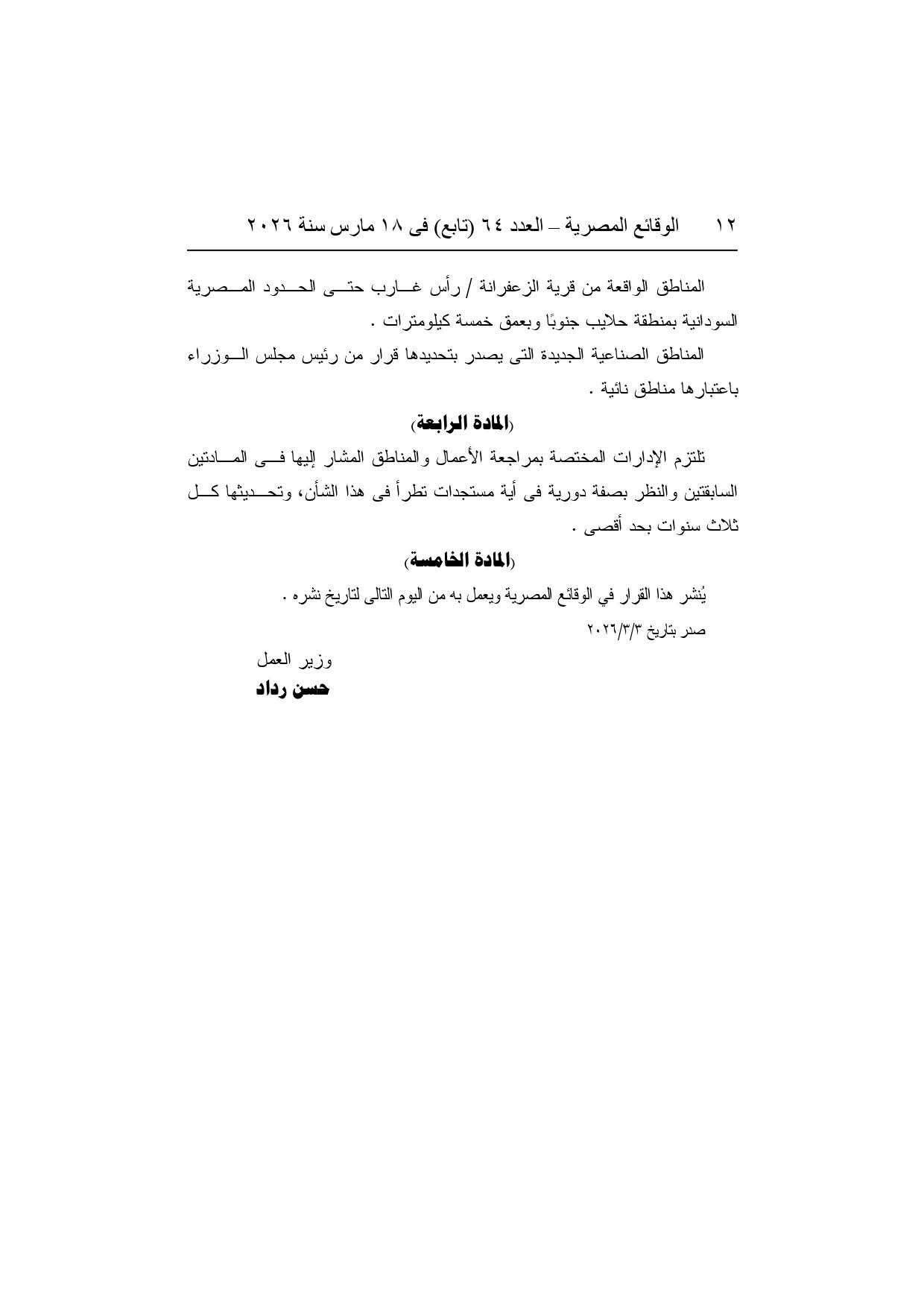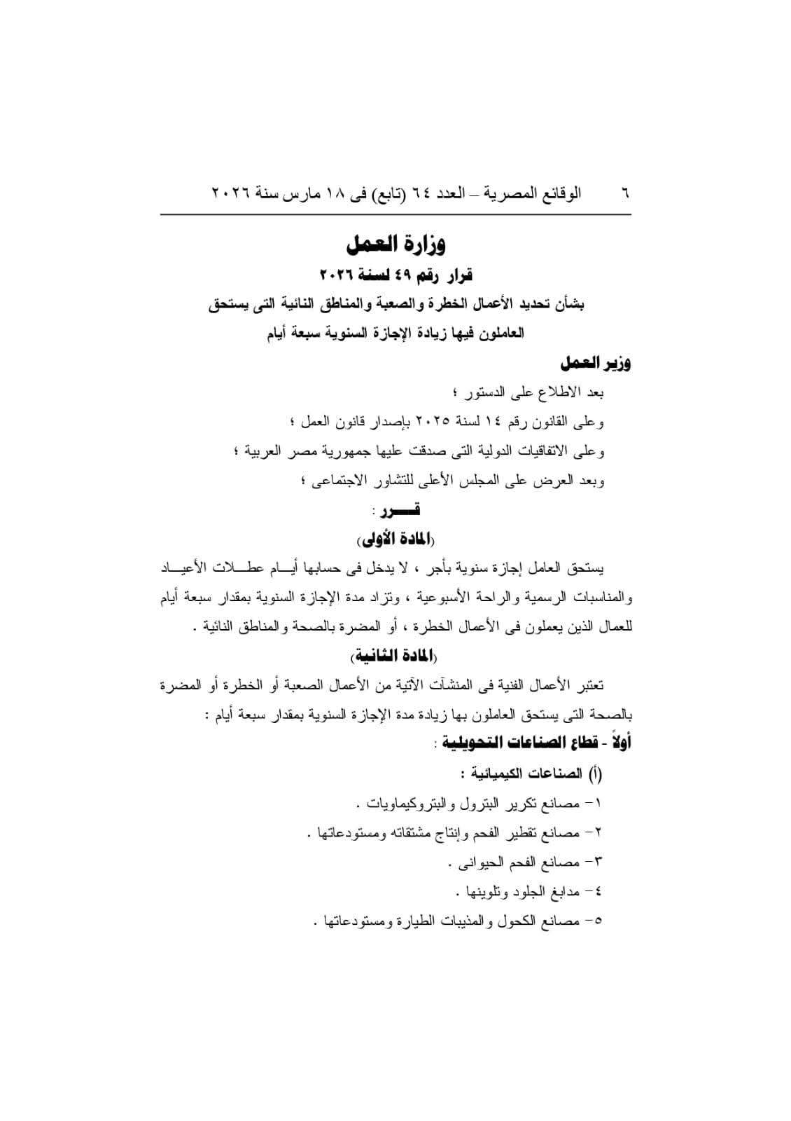 أصدر وزير العمل حسن رداد القرار الوزاري رقم 49 لسنة 2026، تنفيذًا لأحكام قانون العمل رقم 14 لسنة 2025، بشأن تحديد الأعمال الخطرة والصعبة والمناطق النائية على مستوى الجمهورية، والتي يستحق العاملون بها زيادة في الإجازة السنوية لمدة 7 أيام.