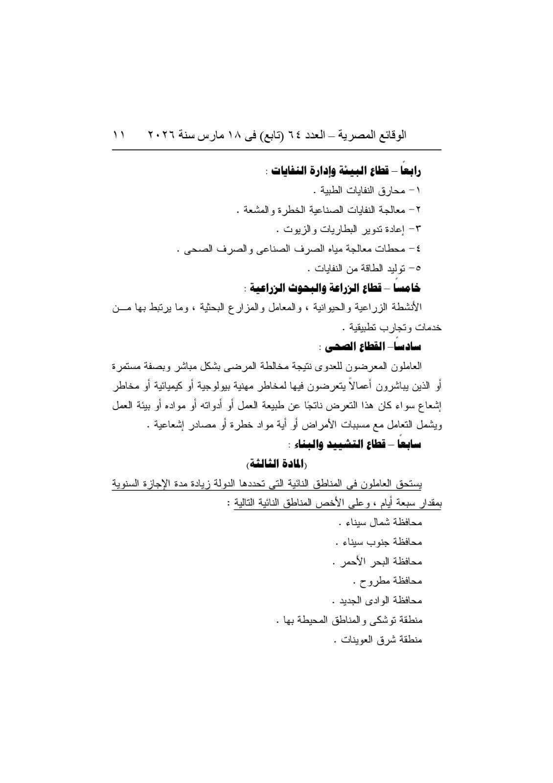 ونصّت المادة الثانية على أحقية العاملين في المناطق النائية في زيادة الإجازة السنوية 7 أيام، خاصة في محافظات: