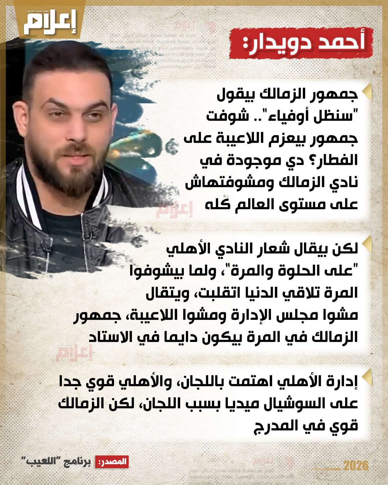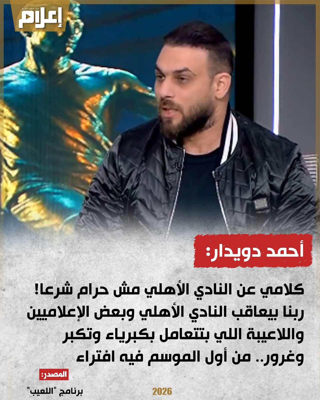قال "دويدار" خلال ظهوره في برنامج "اللعيب"، مع مهيب عبد الهادي، إن حديثه عن الأهلي "ليس حرامًا شرعًا"، معتبرًا أن ما يحدث للفريق هو "عقاب" بسبب ما وصفه بـ"الغرور والتكبر" من بعض العناصر داخل المنظومة منذ بداية الموسم.