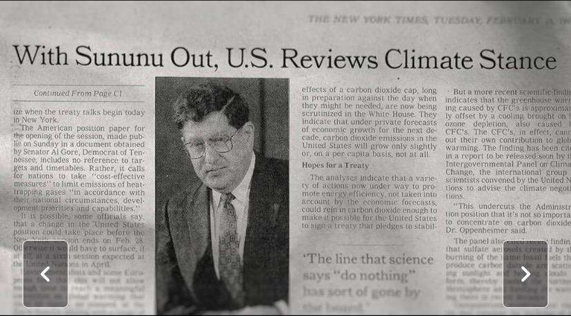 لكن خلف هذا الوجه الودود تظهر تناقضات: بوش خلف الكواليس يعيِّن سونونو، الذي يبدأ تدريجيًا بزعزعة المكانة العلمية لقضية التغير المناخي. الاشتباك بين بوش وسونونو يكشف عن صراعات أيديولوجية عميقة داخل إدارته: من جهة وعود بيئية، ومن جهة أخرى ضغوط من الصناعة وميول محافظة.