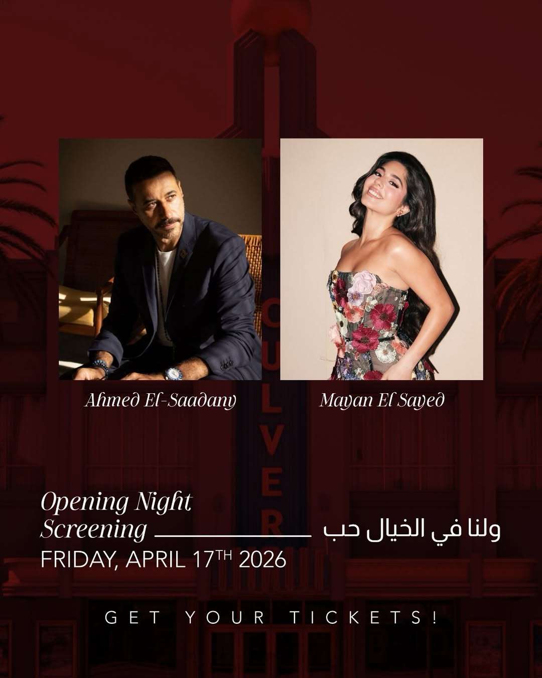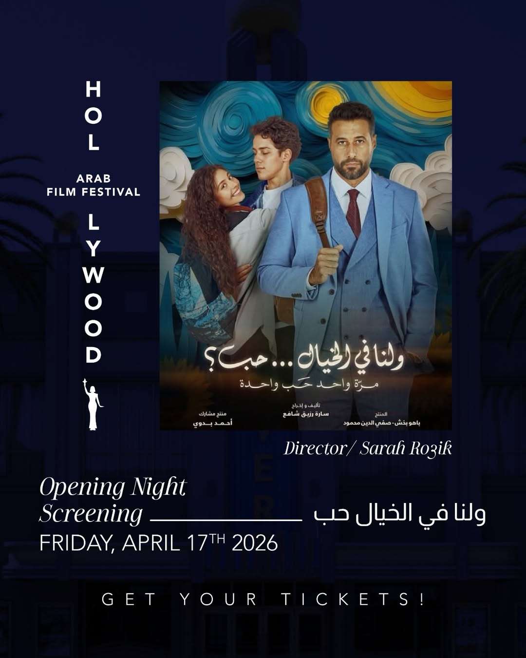 أعلن مهرجان هوليوود للفيلم العربي، أن "ولنا في الخيال حب" هو فيلم افتتاح دورته الخامسة التي تنطلق يوم الجمعة الموافق 17 أبريل المقبل، في لوس أنجلوس بالقرب من استوديوهات هوليوود الشهيرة في ولاية كاليفورنيا، بحضور نجمي العمل أحمد السعدني، ومايان السيد.