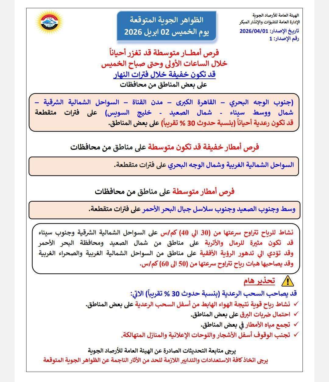 كشفت الهيئة العامة للأرصاد الجوية عن توقعاتها لطقس غد الخميس، الموافق 2 أبريل 2026.