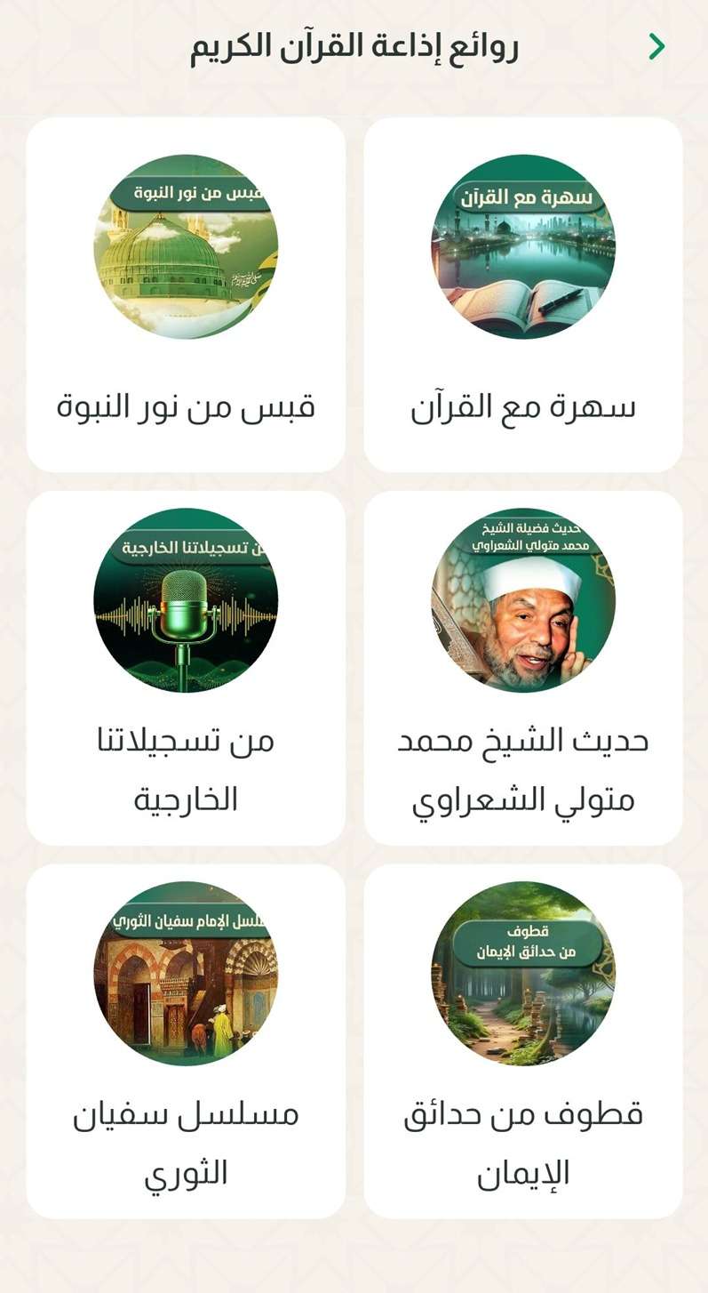4- حديث الشيخ الشعراوي: يوفر التطبيق مكتبة ضخمة تضم 805 حلقات لفضيلة الإمام محمد متولي الشعراوي حول تفسير آيات كتاب الله.