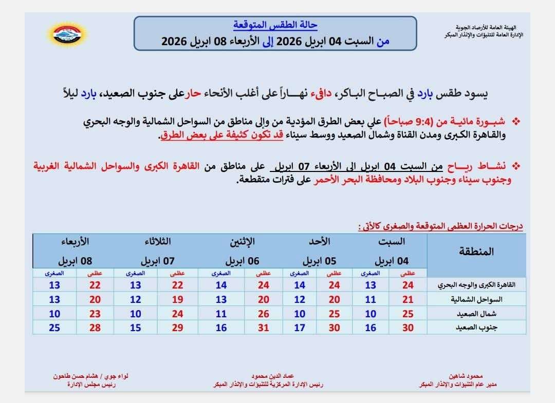 أعلنت الهيئة العامة للأرصاد الجوية حالة الطقس المتوقعة خلال الفترة من السبت 4 أبريل حتى الأربعاء 8 أبريل 2026، حيث يسود طقس بارد في الصباح الباكر، دافئ نهارًا على أغلب الأنحاء، وحار على جنوب الصعيد، بينما يكون الطقس باردًا ليلًا.
