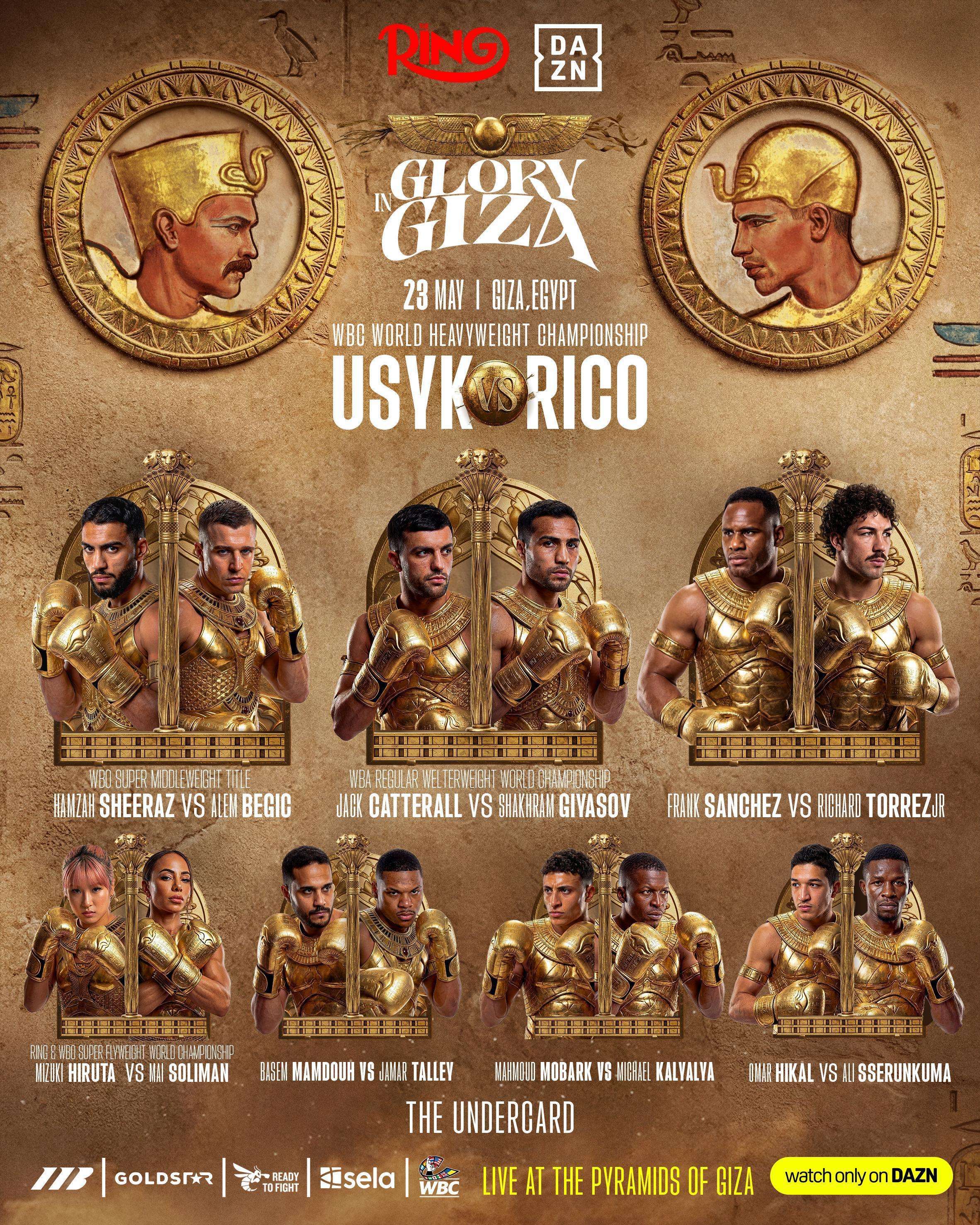 أعلن معالي المستشار تركي بن عبد المحسن آل الشيخ، رئيس مجلس إدارة الهيئة العامة للترفيه (GEA)، ورئيس الاتحاد السعودي للملاكمة، عن تفاصيل البطاقة التمهيدية لعرض Glory in Giza، المقرر إقامته يوم السبت 23 مايو في جمهورية مصر العربية، والتي تضم مجموعة من النزالات العالمية البارزة على ألقاب كبرى، وذلك بالتعاون مع مجلة The Ringوبدعم من شركة Matchroom Boxing.