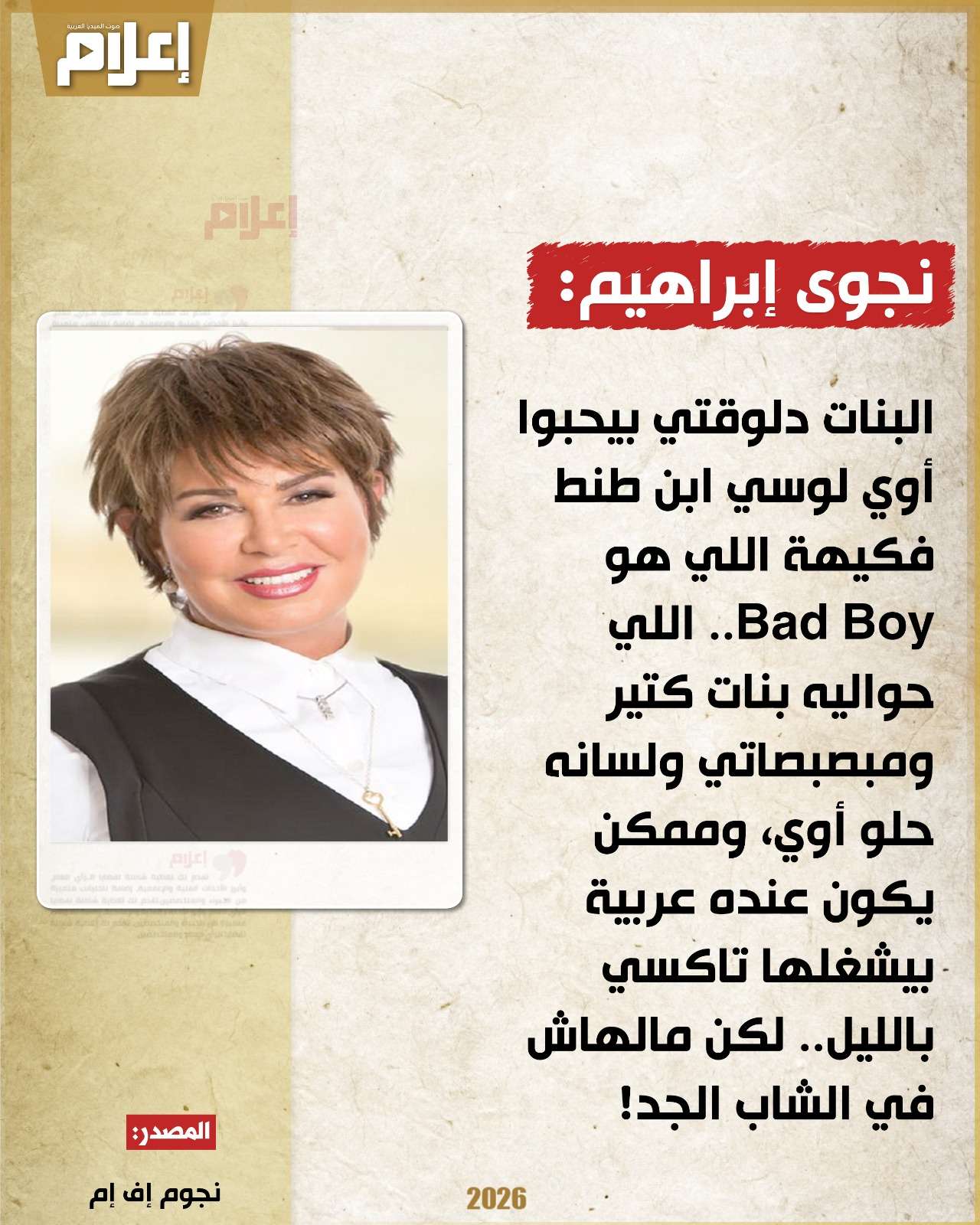 تابعت: "البنات دلوقتي بيحبوا أوي لوسي ابن طنط فكيهة اللي هو Bad Boy.. اللي حواليه بنات كتير ومبصبصاتي ولسانه حلو أوي، وممكن يكون عنده عربية بيشغلها تاكسي بالليل.. لكن مالهاش