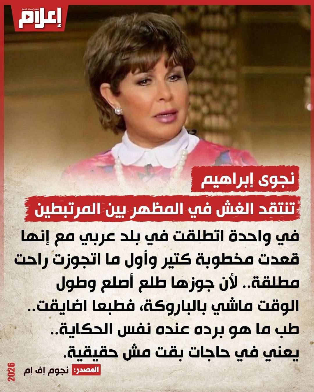 انتقدت الإعلامية نجوى إبراهيم، بعد الأفعال التي يرتكبها البعض خلال فترة الخطوبة أو الارتباط بشأن الغش في المظهر.