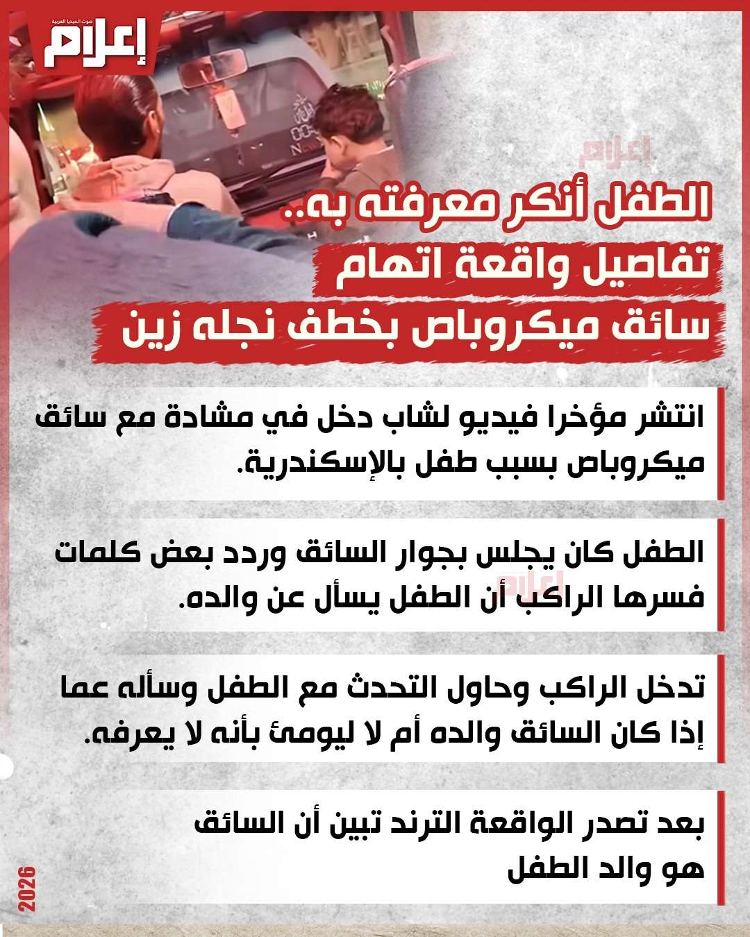 جدل كبير أثير على مواقع التواصل الاجتماعي، بعدما تم تداول مقطع فيديو لراكب يتهم سائق ميكروباص بخط طفل كان يجلس بجواره في الإسكندرية.