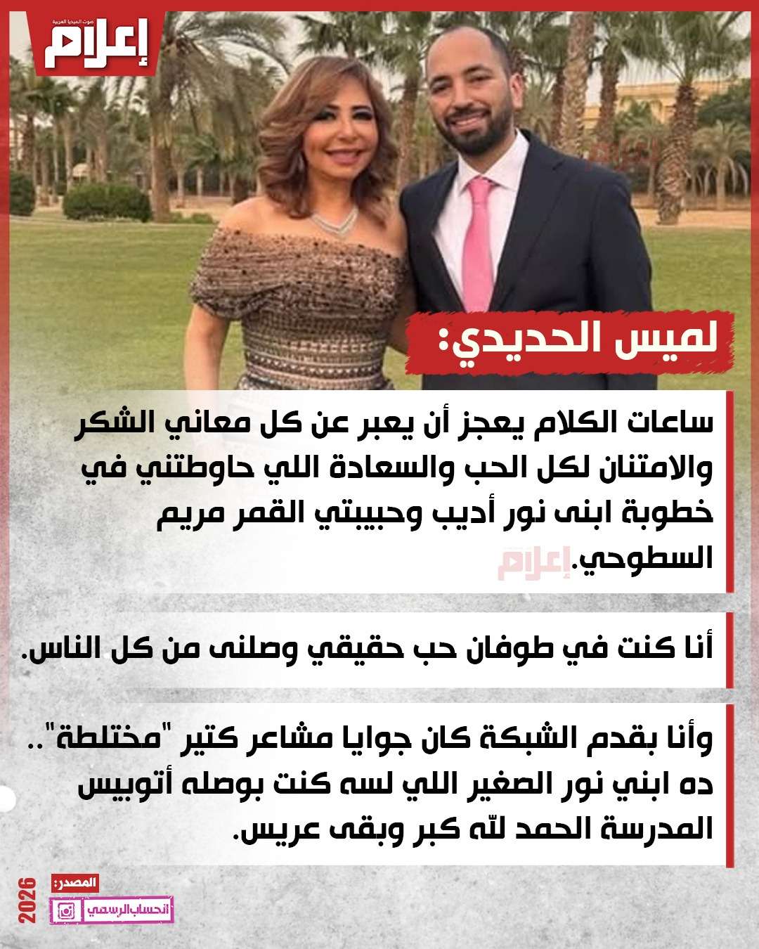 من جانبها، عَبرت "الحديدي" عن سعادتها بخطوبة نجلها، حيث نشرت صور لها من حفل الخطوبة وعلقت كاتبة: "ساعات الكلام يعجز أن يعبر عن كل المعاني.. معاني الشكر والامتنان لكل الحب والسعادة اللي حاوطتني في خطوبة ابني نور أديب وحبيبتي القمر مريم السطوحي.. المشاعر الحقيقية بتبان وبتوصل وأنا امبارح كنت في طوفان حب حقيقي وصلني من كل الناس: عائلة مريم الجميلة اللي زودوا عيلتي أهلي وعائلة ابني وأصحابي اللي دايما سندي وفي ضهري، صوت صديق عمرى هشام عباس اللي ملا الدنيا فرح، سعادة.. ليلى علوى و إلهام شاهين وهاله صدقي.. كل الاتصالات اللي وصلتني من مصر ومن خارج مصر.. كلها كانت امبارح طاقه فرح امدني الله بها".