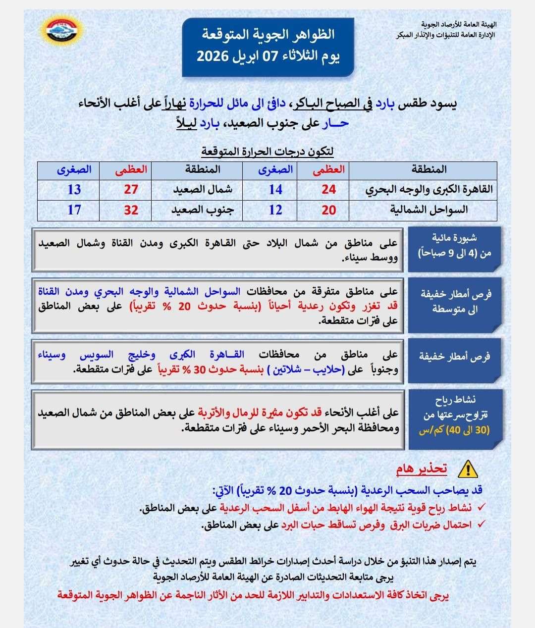 أعلنت الهيئة العامة للأرصاد الجوية توقعاتها لحالة الطقس غدًا الثلاثاء 7 أبريل 2026، حيث يسود طقس بارد خلال ساعات الصباح الباكر، يميل إلى الدفء نهارًا على أغلب الأنحاء، ويكون حارًا على جنوب الصعيد، بينما يعود الطقس للبرودة ليلًا.