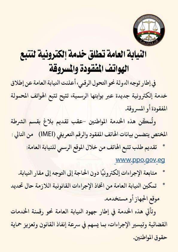 أوضحت النيابة أن الاستفادة من الخدمة تتطلب تقديم بلاغ بقسم الشرطة المختص يتضمن بيانات الهاتف المفقود والرقم التعريفي (IMEI)، ثم التقدم بطلب تتبع الهاتف من خلال الموقع الرسمي www.ppo.gov.eg، مع إمكانية متابعة الإجراءات إلكترونيًا دون الحاجة إلى التوجه لمقر النيابة.