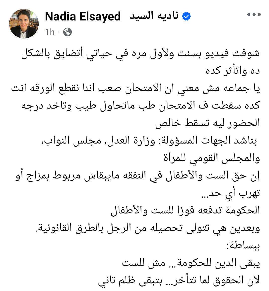 تابعت: "بناشد الجهات المسؤولة: وزارة العدل، مجلس النواب، والمجلس القومي للمرأة، إن حق الست والأطفال في النفقة ميبقاش مربوط بمزاج أو تهرب أي حد.. الحكومة تدفعه فورًا للست والأطفال".