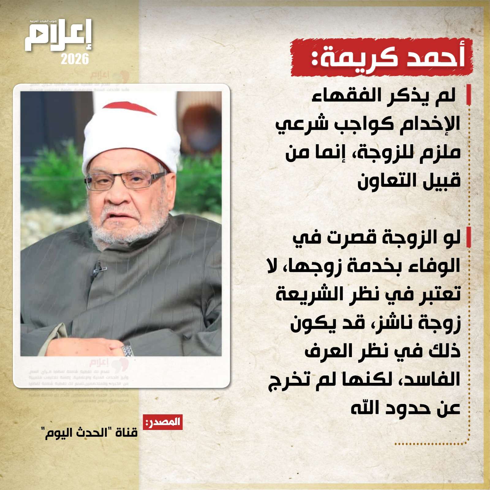 كما شدد الدكتور أحمد كريمة، على ضرورة التمييز بين الموروثات العرفية وبين الأحكام الشرعية المنضبطة فيما يتعلق بالعلاقة الزوجية، مؤكدًا أن مفهوم "النشوز" لا ينطبق شرعًا على المرأة التي تقصر في الخدمة المنزلية.