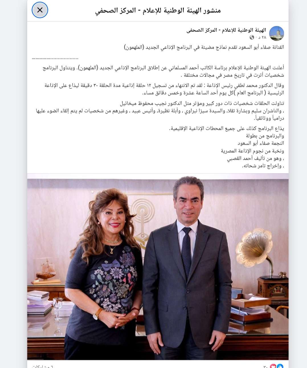 قال الدكتور محمد لطفي، رئيس الإذاعة: "لقد تم الانتهاء من تسجيل 12 حلقة إذاعية مدة الحلقة 30 دقيقة ليذاع على الإذاعة الرئيسية "البرنامج العام" كل يوم أحد الساعة 10:05 مساءً".