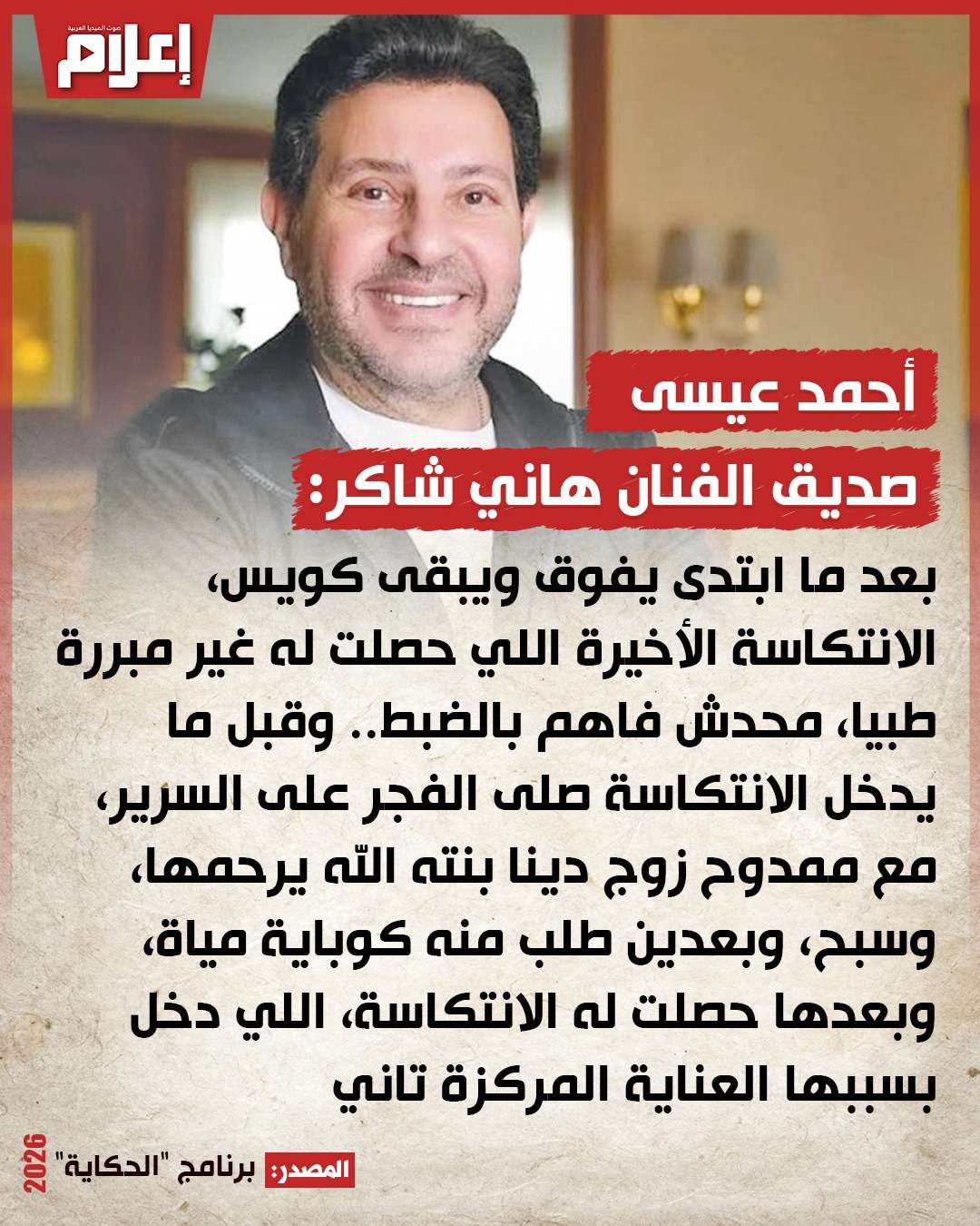 حكى رجل الأعمال أحمد عيسى، صديق هاني شاكر، تفاصيل اللحظات الأخيرة للفنان، قبل تعرضه لانتكاسة صحية مجددا.