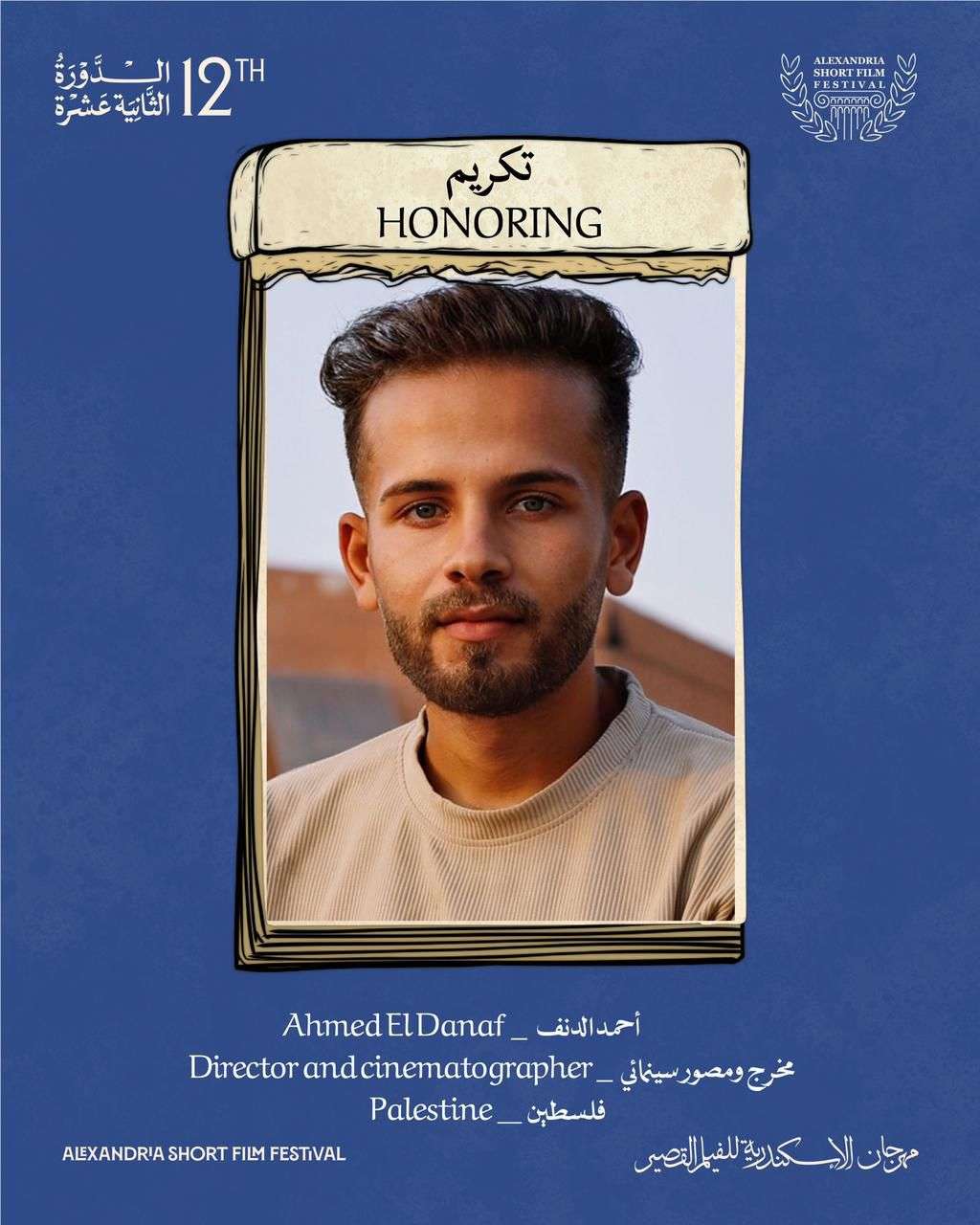 أما أحمد الدنف، فهو مصور سينمائي وصانع أفلام من غزة، نال فيلمه القصير "يوم دراسي" جائزة يوسف شاهين في مهرجان القاهرة السينمائي الدولي 2024، وشارك في عدة مهرجانات دولية.