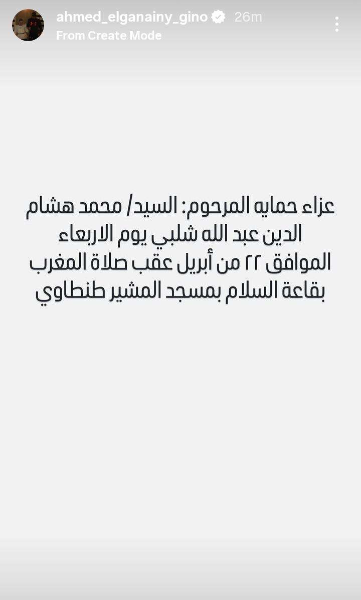 كتب "الجنايني" عبر خاصية القصص القصيرة عبر حسابه على "إنستجرام": "عزاء حمايا المرحوم محمد هشام الدين شلبي يوم الأربعاء الموافق 22 إبريل 2026".