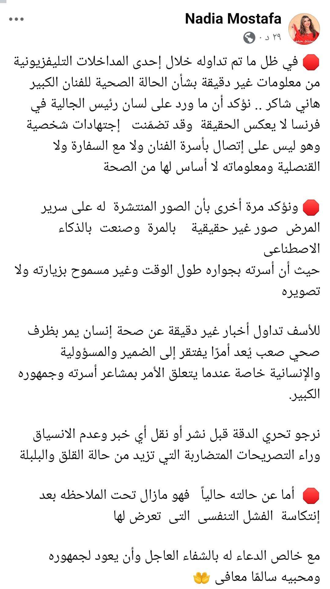 نفت الفنانة نادية مصطفى ما تم تداوله مؤخرًا بشأن الحالة الصحية للفنان هاني شاكر، مؤكدة أن المعلومات التي وردت خلال إحدى المداخلات التليفزيونية غير دقيقة ولا تعكس الحقيقة.