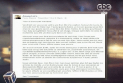 عرض الإعلامي عمرو خليل رسالة من أحد المواطنين الفرنسيين، إلى زوجته وقاتليها من تنظيم “داعش” الإرهابي، والتي قتلت خلال هجمات إرهابية شهدتها العاصمة الفرنسية، باريس، في 13 نوفمبر الماضي، حيث قال خليل بأن تداعيات هذا الحادث ليست فقط أمنية، ولكن إنسانية أيضًا.
