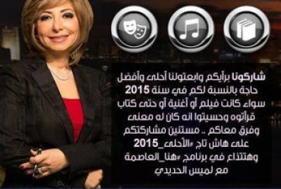 أطلقت الإعلامية لميس الحديدي في برنامجها “هنا العاصمة”، المذاع عبر شاشة “CBC”، هاشتاج ”#الأحلى_2015″، مطالبة الجمهور بالتفاعل معه وتحديد الفيلم أو الأغنية أو الكتاب، الذي نال إعجابهم بنسبة كبيرة، معلنة أنها ستذيع النتائج في برنامجها.