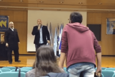 وخلال الفيديو، لم يستطع سالم أن يقول سوى كلمات قليلة، منها الحديث الذي وجهه للطالب الذي اتهمه بالتطبيع، حيث رد قائلًا: “لو انت في مصر هتتحبس على هذا الكلام”، وهو ما أثار غضب عارم بالقاعة، حيث رد الطلاب: “ومين قالك انه مش بيتقبض علينا هنا؟ روح قول هالحكي لعيلة الدوابشة”.