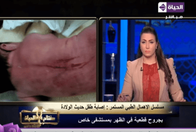 وقالت مها جدة الطفل فى اتصال هاتفى : ابنتى أنجبت بولادة طبيعية ، وفوجئت بأن طبيبة الأطفال دخلت علينا وتنصحنا بأن نضع الطفل على جنبه ، وهذا لا يحدث فى الأوضاع الطبيعية ، وحينما عدنا للبيت وجدنا الطفل يبكى بإستمرار ، حتى اكتشفت هذه الجروح ، وحينما سألنا قالوا لنا أن “الفوطة” خشنة فجرحته، ولكن أحد الأطباء قال لنا أن هذه الجروح بآلة حادة ، وأخذت تقريرا بذلك.