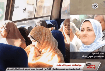 وأشادت السعيد بظاهرة تخصيص بعض المواصلات للنساء فقط مثل عربات المترو، وسيارات الأجرة، والأتوبيس، وأكدت أن هذا ليس سلوكاً تمييزياً، بل يهدف لراحة السيدات وأضافت: “في أي مكان بالعالم كون انك تخصص أماكن مخصوصة لما يكون فيه زحام للستات مع بعض، ده بالمقام الأول مردوده يعود على السيدة”.