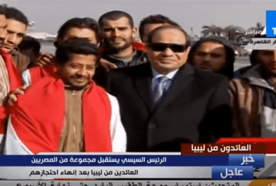 استقبل الرئيس السيسي، اليوم الثلاثاء، في مطار القاهرة، المصريين العائدين من ليبيا، بعد إنهاء احتجازهم هناك.