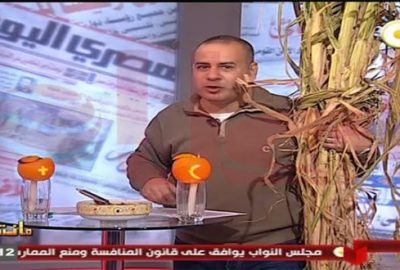 وأحضر “القرموطي”، في برنامجه “مانشيت” المذاع على فضائية” ON TV “، حزمة قصب، وطبق “قلقاس”، وقفص برتقال، معه إلى الأستوديو في مستهل الحلقة.