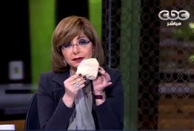 ظهرت الإعلامية لميس الحديدي في حلقة السبت من برنامجها “هنا العاصمة” على قناة cbc ومعها حجر من هرم خفرع، بعد أن قام مراسل القناة خالد جمال بعمل جولة للأهرامات اليوم وقام بجلب هذا الحجر.