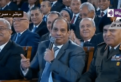 وتابع السيسي موجهًا حديثه للشعب المصري بحزم: “إنتوا فاكرين نفسكوا ضعاف ولا إيه؟ إيه ده؟ الناس مش واخدة بالها إن مصر دولة كبيرة”، وواصل: “لو بتحبوا مصر صحيح، اسمعوا كلامي، أنا بس اللي بقول للمصريين اللي بيسمعوني”، ومن ثم ضحك الحاضرين بمشاركة الرئيس.